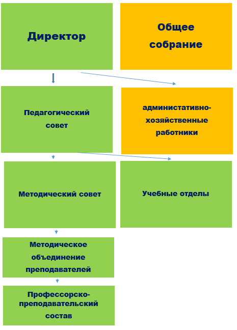 Органами управления Центра являются: общее собрание, наблюдательный совет, педагогический совет; полномочным руководителем является директор. |